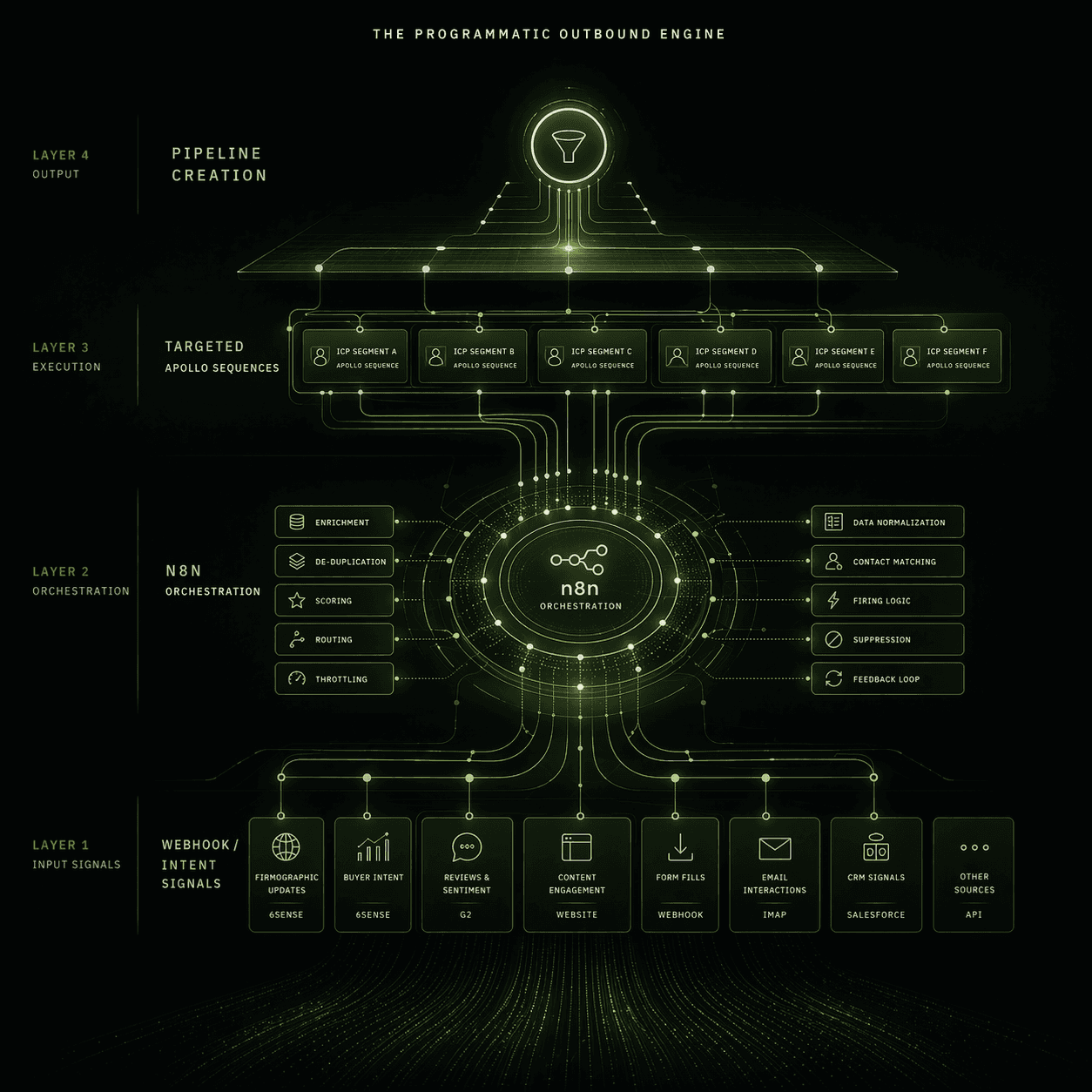 This post breaks down the exact programmatic architecture we build at Chronexa to eliminate that lag: automated Apollo sequence enrollment driven by real-time intent webhooks, enriched and routed through n8n, with intent context synced to custom Salesforce dashboards.