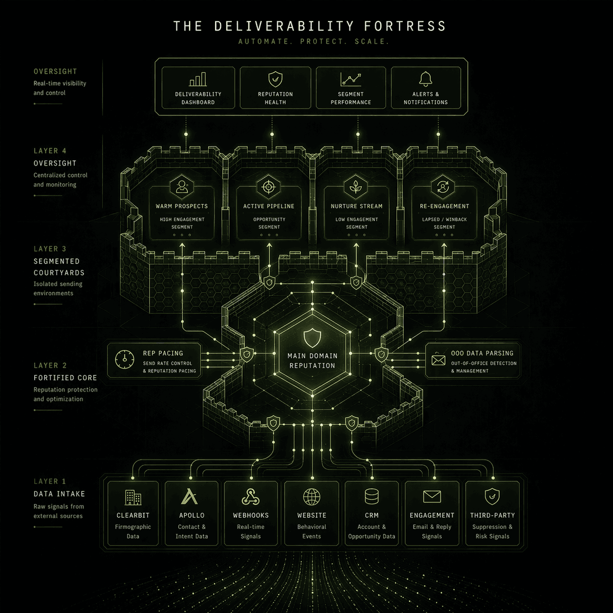 [DIAGRAM: The Deliverability Fortress — Raw external data streams from Apollo and Clearbit enter at the base. A filtering gateway divides them into three isolated segmented courtyards (ICP Tier 1, Warm Leads, Cold Outreach), each mapped to a dedicated sending subdomain. The core domain node sits protected at center with shield overlays. Rep Pacing and OOO Parsing run as parallel vertical pipelines through the entire structure. The apex shows clean, protected outbound email streams.]