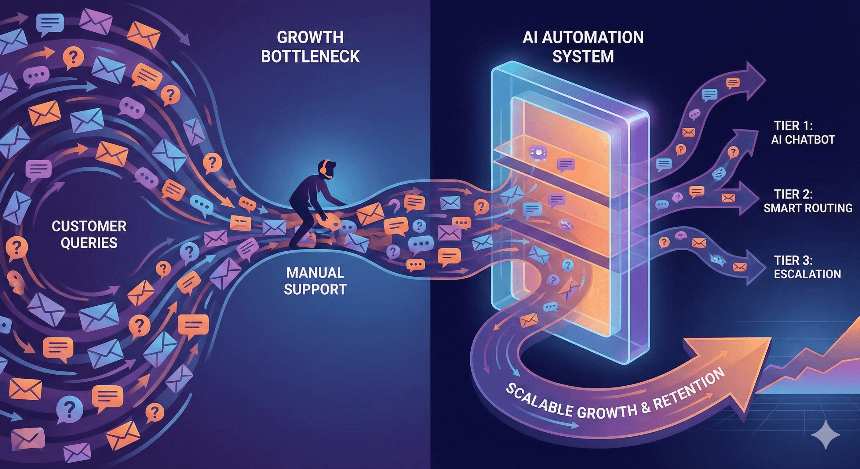 The solution is not to replace humans but to empower them by automating the repetitive work. We implement a 3-tier automation system that intelligently routes queries based on complexity and customer value.