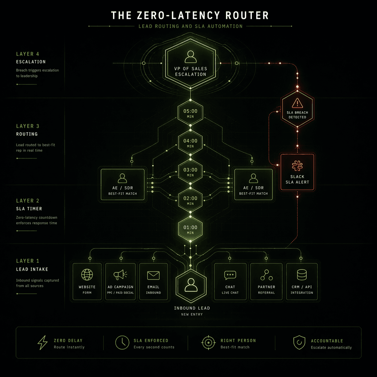 This is not punitive — it's operational transparency. Reps who know the escalation is automated respond to leads within 5 minutes. The architecture changes behavior by making the SLA visible, not by writing it into an employee handbook.