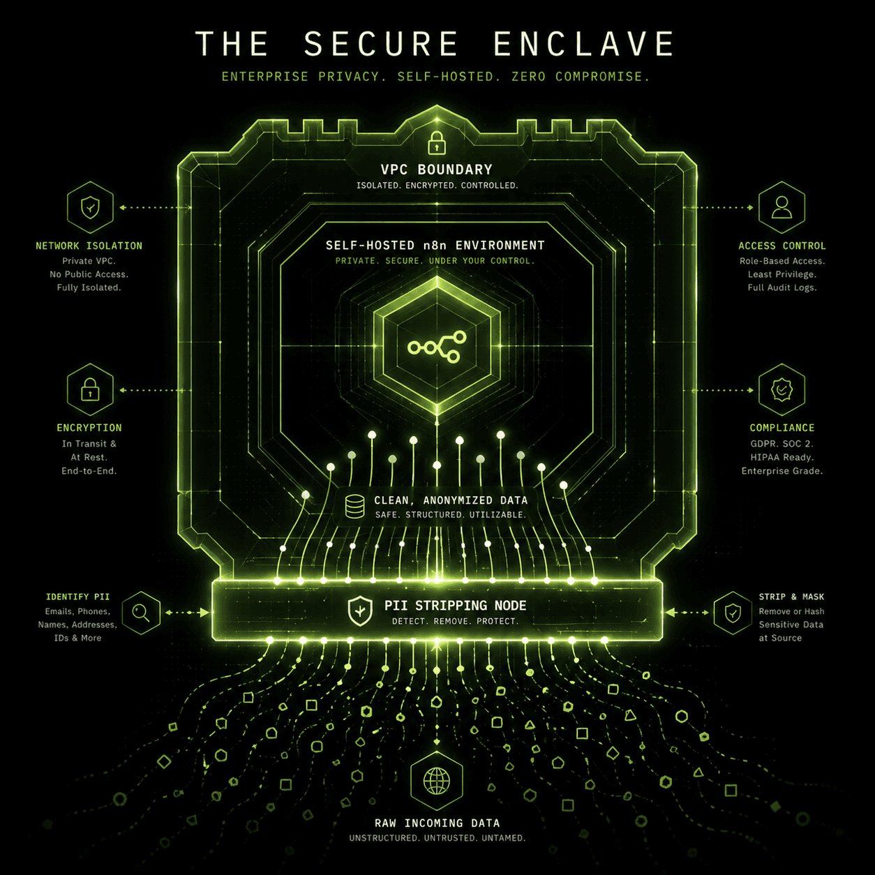 Their reasoning is airtight. Off-the-shelf automation platforms like Zapier, Make, and even managed cloud instances of n8n require you to push your proprietary company data, financial records, and Personally Identifiable Information (PII) through public, multi-tenant cloud environments. Routing unencrypted customer data through a public API and into OpenAI's commercial endpoints is a massive security breach. It violates data residency laws, breaches HIPAA regulations, and will instantly fail your SOC2 audit.